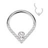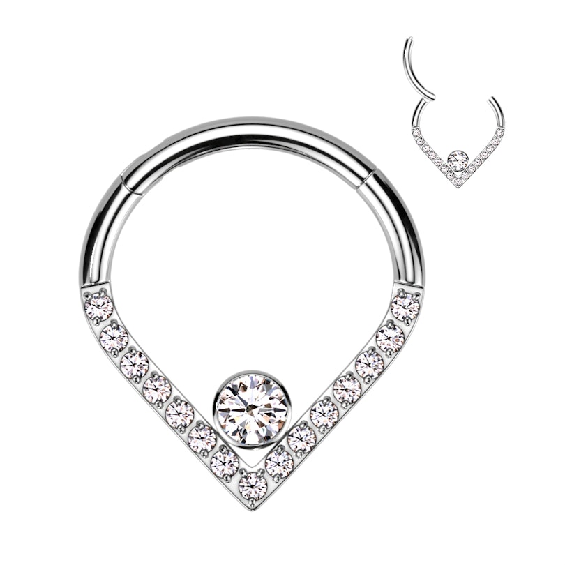 Deze scharnierende ring uit titanium is versierd met steentjes, waarbij het midden van het chevron design wordt verfraaid met een grote steen.