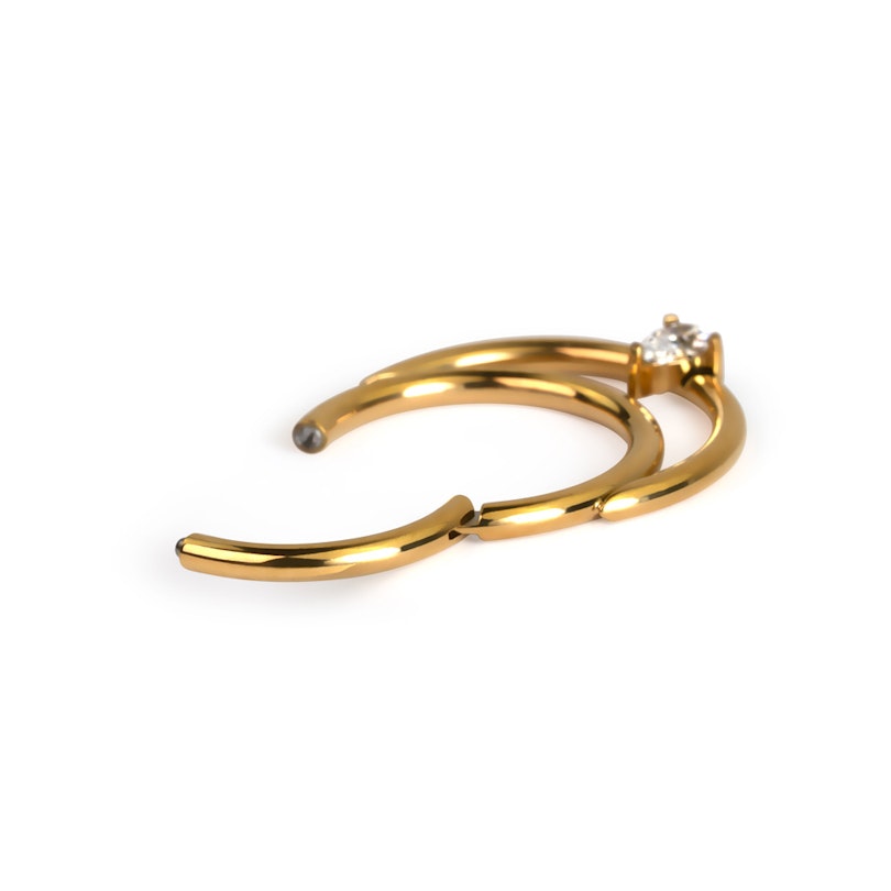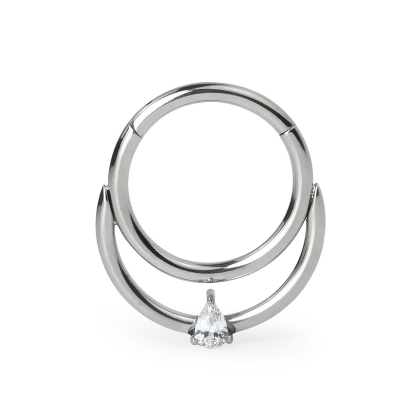 Deze scharnierende segment ring van titanium met druppelvormige steen balanceert niet ƩƩn maar twee ringen. Dit prachtige sieraad overstijgt elegantie met haar tijdloze druppelvormige steen dat de twee ringen een geheel maakt. Het sieraad is beschikbaar in zowel goud als zilver, heeft een draaddikte van 1.2 mm en een diameter van 6 mm of 8 mm. Perfect dus, voor je helix, daith of septum