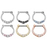 Deze mooie en vrouwelijke septumclicker is gemaakt van zuiver chirurgisch staal, en versierd met vijf charmante steentjes. Het steentje dat in het midden zit is iets groter dan de andere vier, wat de indruk wekt dat de ring druppelvormig is.
