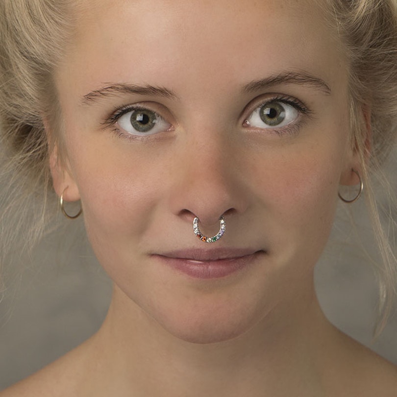 Dit sieraad wordt een septumclicker genoemd, wat betekent dat je het heel eenvoudig in kunt doen en kunt sluiten door het te klikken, en ook weer kunt openen door het te klikken. De kleine staaf die door de piercing gaat, open en sluit je dus met een eenvoudige klik.