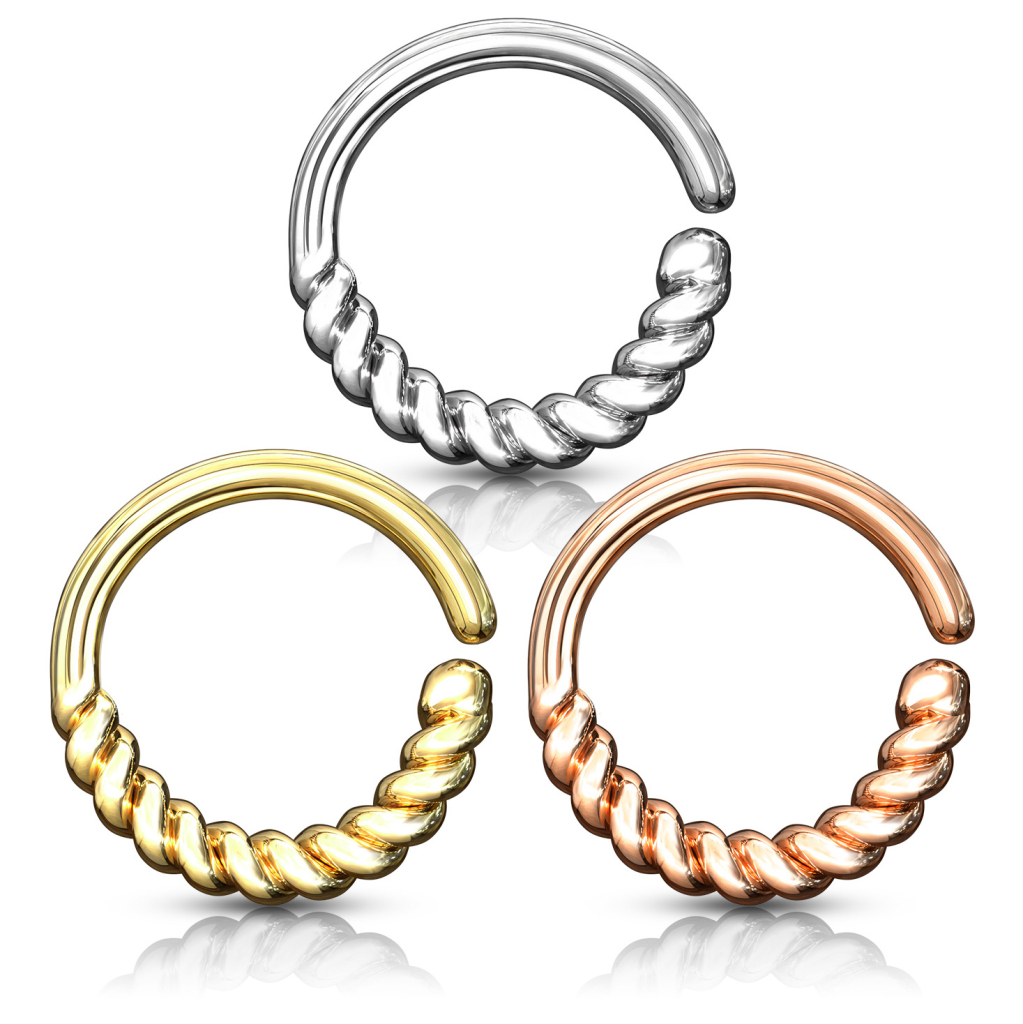 Dit juweel, zoals je op de foto kan zien, is een ring voor je septum waarvan de onderste helft gevlochten is. Het bestaat uit ƩƩn stuk metaal, wat betekent dat je de uiteindes van de ring ietwat uit elkaar moet trekken om hem in je neus te doen; maak je geen zorgen over het sluitmechanisme. Eenmaal je de uiteindes loslaat, blijft de ring goed op zijn plek zitten. De ring is gemaakt van het metaal messing dat gecoat werd om zijn bijzondere geelgouden, roodgouden of zilveren kleur te verkrijgen. Je kan de verschillende kleuren zien in de foto bovenaan.
