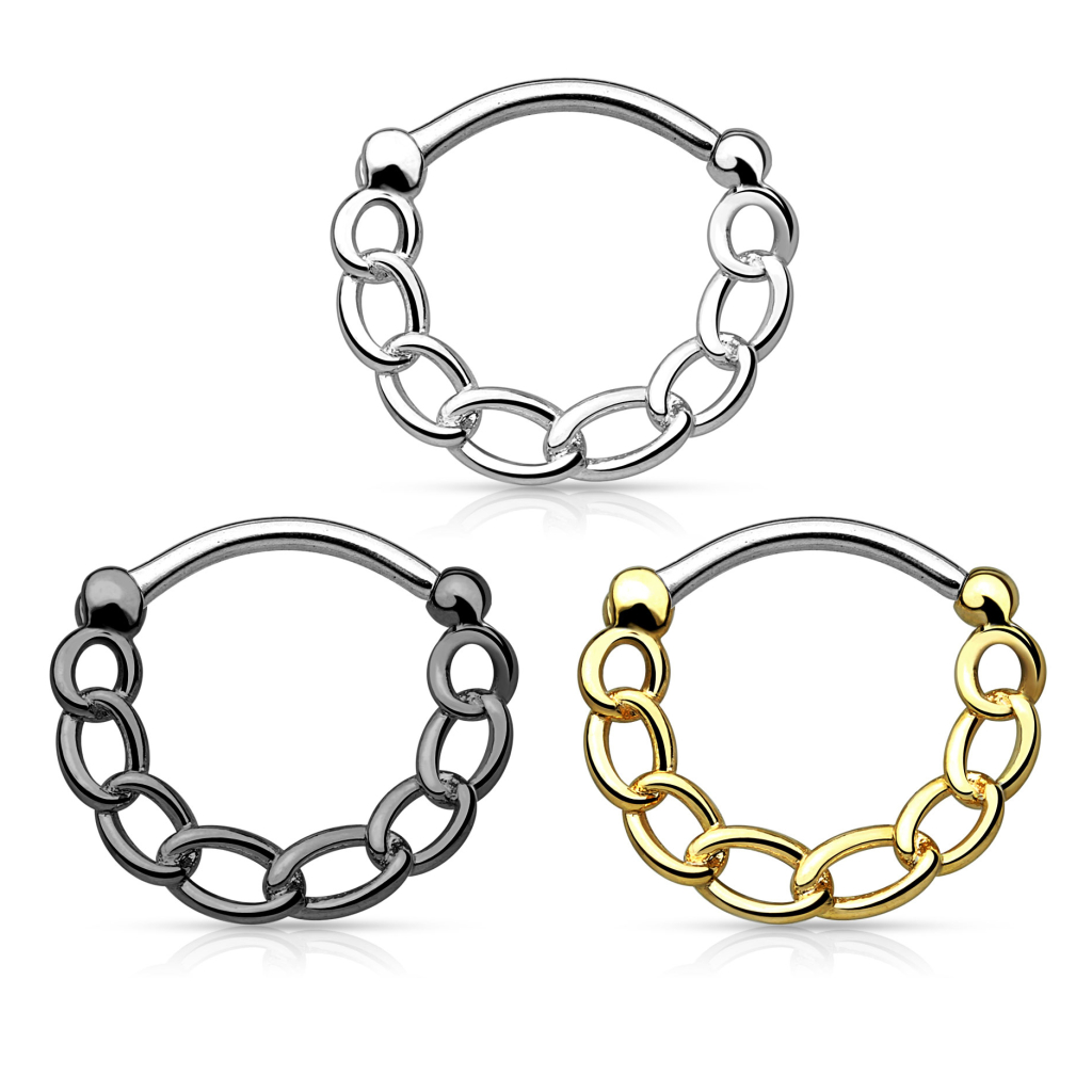De ring is gevormd als een ketting om het een beetje een ruige look te geven, en als een alternatief op de vele prinses-achtige septumpiercings met steentjes en glittertjes. De ketting is op een discrete manier gelast, zodat het zijn vorm behoudt wanneer je het in je neus draagt. Het is dus met andere woorden een ''stijve'' ketting, en de ketting zal ook geen geluid maken of bewegen wanneer je het in je septumpiercing draagt. Het zal juist zijn ronde vorm behouden.