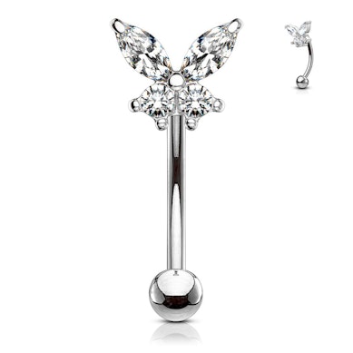 Een andere populaire plaatsing voor gebogen staafjes is de wenkbrauwpiercing. Deze plaatst de versiering aan de zijkant van je gezicht en geeft je look finesse terwijl je toch de show steelt. Daarom kan je zelfs met een redelijk low-key design, zoals zwarte spikes, wonderen verrichten. Omdat je gezicht constant in beweging is kan je flexibele sieraden overwegen om jezelf wat milde irritaties te besparen, afhankelijk van je gelaatstrekken en smaak.