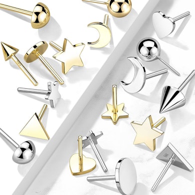 Er zijn verschillende soorten sluitingsmechanismen, dus je moet de piercingonderdelen vinden die passen bij de sieraden die je al hebt. Als je piercingballetjes een interne schroefdraad hebben, en je wilt een nieuw recht staafje om ze op te draaien, dan moet het een staafje zijn met een externe schroefdraad. En als je balletjes hebt die je wilt vervangen door iets glanzends en kleurrijk, koop ze dan met interne schroefdraad. Als je op zoek bent naar nieuwe tops voor een push-in labret, vergeet dan de schroefdraad en zoek decoraties met een push-in pin. We hebben ook sluitingsmechanismen voor ringen, zoals een captive bead die op z'n plaats wordt gehouden door spanning op de uiteinden van de ring. Wat je ook nodig hebt, vergeet niet te controleren of de maten overeenkomen.