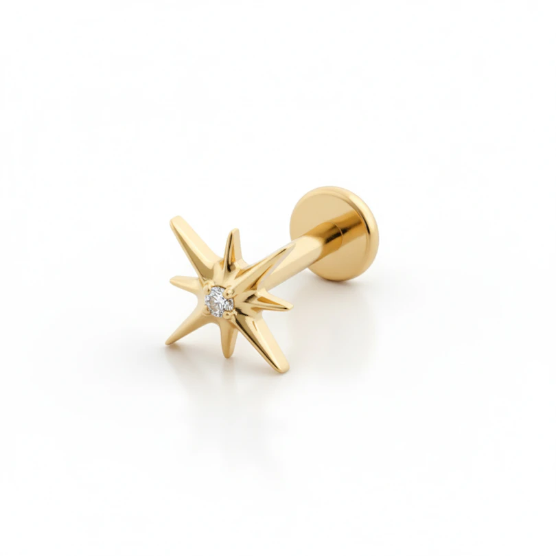 Deze stervormige labret met centrale steen van titanium is gemaakt voor degenen die hun sieraden met wat meer drama willen. Het stervormige ontwerp bevat een centrale steen. Beschikbaar in gouden of zilveren afwerkingen, is het een opvallend detail in elk oor.