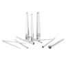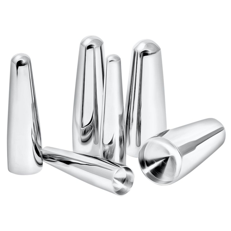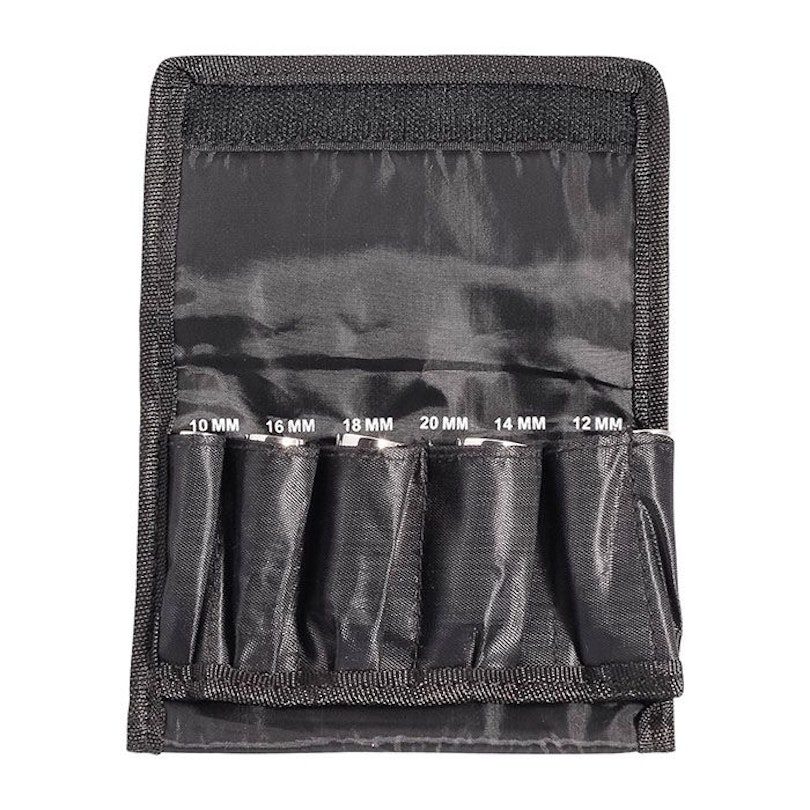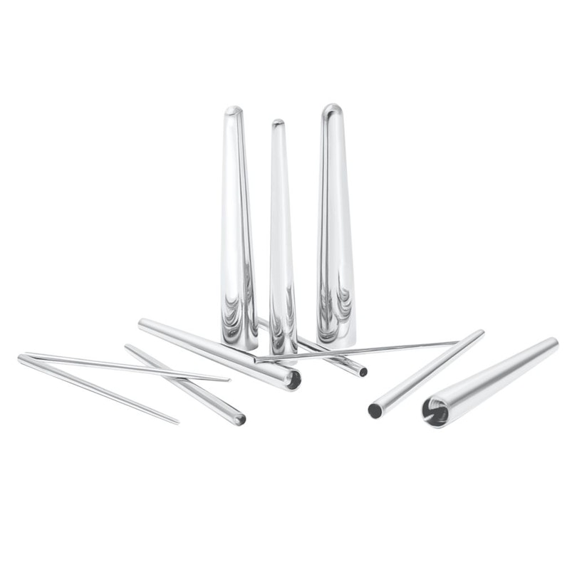 Bij het kleine model ontvang je tapers die uiteenlopen van 1 mm tot 8 mm. Het grote model gaat verder waar het kleine model eindigt, en gaat van 10 mm tot en met 20 mm. Voor beide modellen geldt dat de uiteinden, dus de dikste uiteinden, een gat hebben dat correspondeert met de dikte van het het sieraad. Dat betekent dat de taper van 10 mm eigenlijk aan de achterkant 11 mm is. Het is de bedoeling dat je het sieraad aan de achterkant inzet, het dunste punt eerst natuurlijk, en dan doorschuift. Als je over gaat op de volgende grootte, dan kun je die in het gat zetten van de taper die je momenteel draagt, en dan makkelijker in een beweging de nieuwe taper in doen.