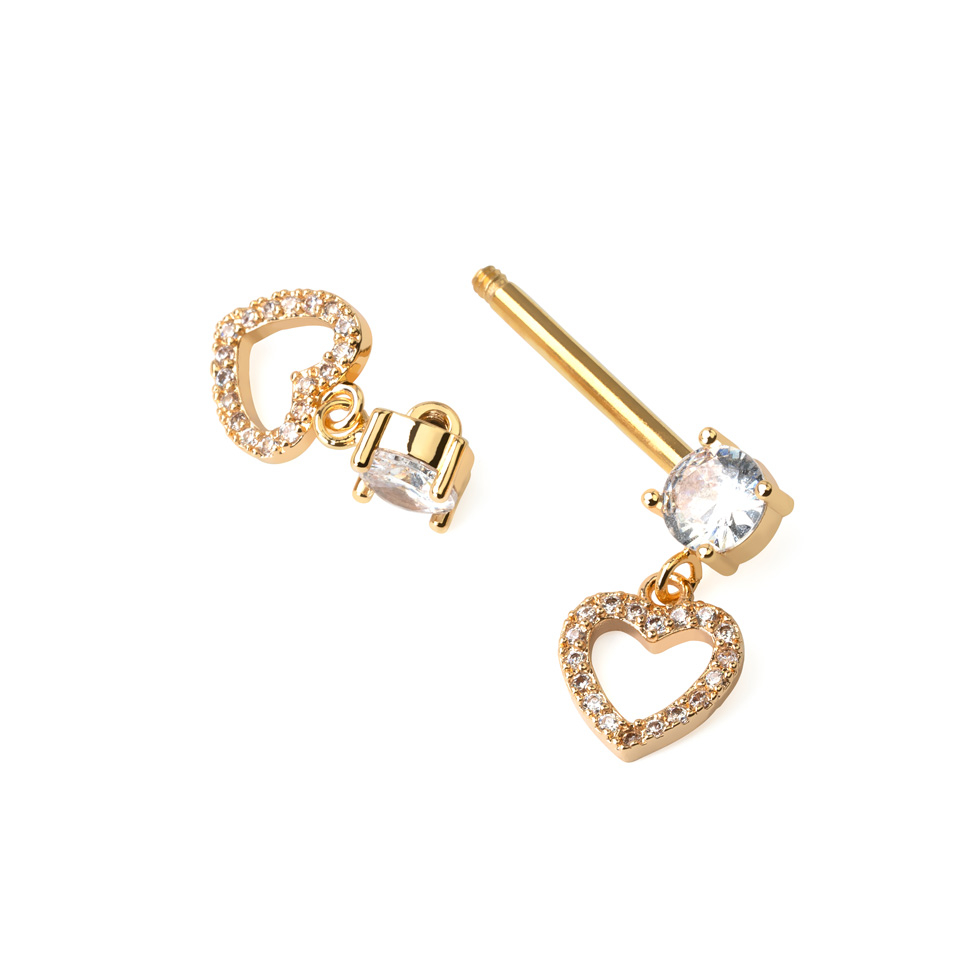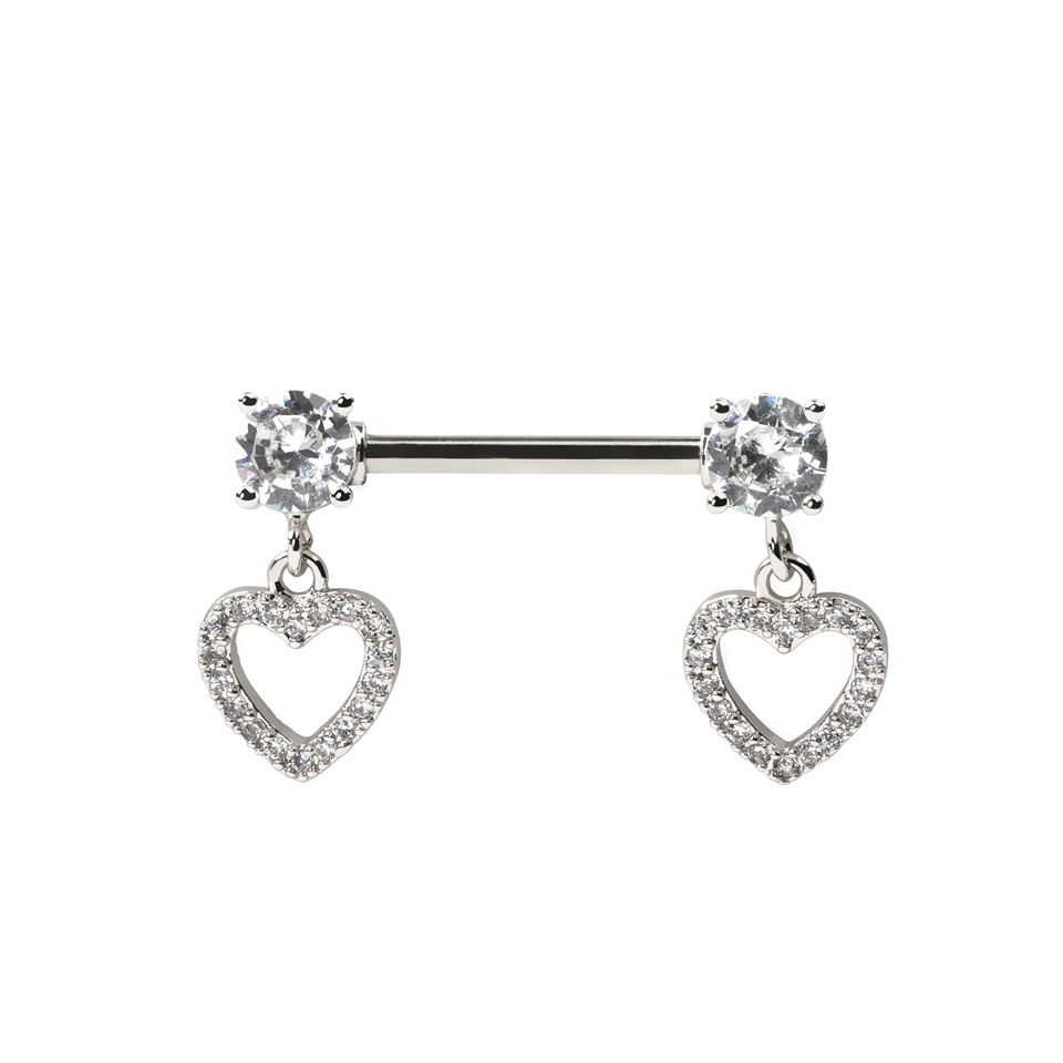 Dit mooie tepel staafje heeft een CZ steentje aan beide uiteinden, waaraan een lief hartje hangt gezet met nog meer CZ steentjes.