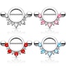 De onderkant van de glanzende ring is versierd met ronde facetgeslepen steentjes, die verkrijgbaar zijn in verschillende kleuren combinaties. De steenboog bestaat uit vijf grote, ronde steentjes samen met vier kleinere, ronde steentjes die elkaar afwisselen. De kleine steentjes zijn transparant, maar de grote steentjes zijn in verschillende kleuren te kiezen. Je kunt dit sieraad natuurlijk ook gewoon met enkel transparante steentjes kiezen als je heel erg van de klassieke en stijlvolle look houdt. Maar als je juist liever wat kleur aan je piercings wilt zien, dan kun je kiezen tussen de rode, de roze en de turquoise steentjes.