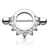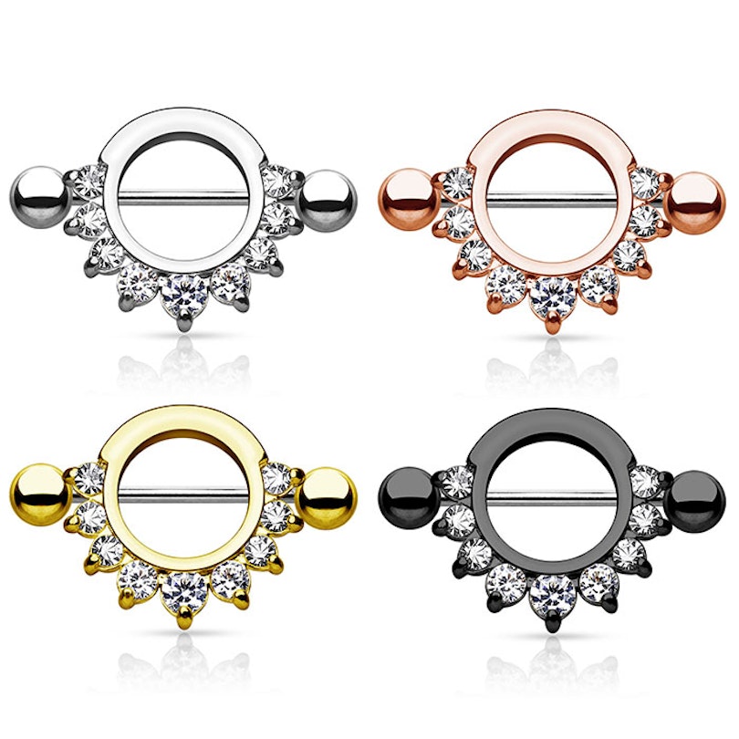 Is het weer tijd om je tepelpiercing te verwennen met een prachtig nieuw sieraad? Dan is dit mooie tepelschild hier misschien wel precies waar je naar op zoek bent. Deze tepelpiercing bestaat uit een staaf die door een gesloten ring gaat, en waarvan het onderste deel de vorm heeft van een mooie met steentjes bezette halve maan. Er zitten in totaal negen mooie druppelvormige steentjes op de ring, en samen vormen ze een prachtige halve maan.