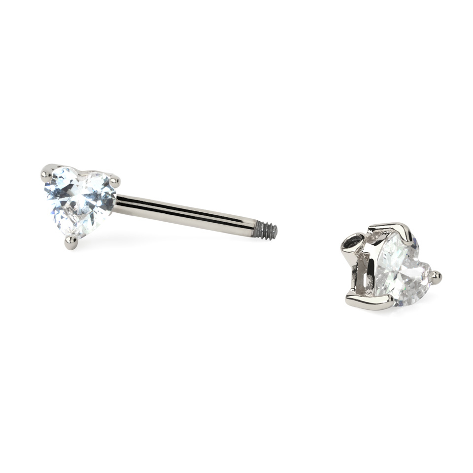 Het ene hartvormige steentje kan worden afgeschroefd zodat je het sieraad heel makkelijk en snel kunt in zetten om daarna het steentje er weer op te schroeven. Het sieraad heeft een draaddikte van 1,6 mm en een lengte van 12 mm. Dat betekent dat het enige waar je uit kan kiezen de kleuren voor je sieraad zijn. De maat is namelijk bij alle modellen helemaal hetzelfde.