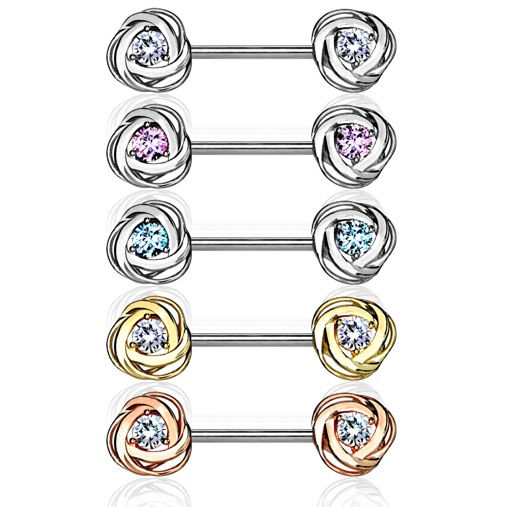 Je kunt zelf kiezen voor welke kleuren en kleuren steentjes in de roosjes je gaat. De roosjes zijn verkrijgbaar in drie verschillende kleuren, waarbij de steentjes bij de goudvarianten altijd transparant zijn - de blank glanzende uitgave heeft verschillende steenkleuren waartussen je kunt kiezen. Een aantal van de rozenblaadjes zijn geperforeerd, zodat je ook nog een klein beetje extra huid kunt zien door de tepelpiercing.