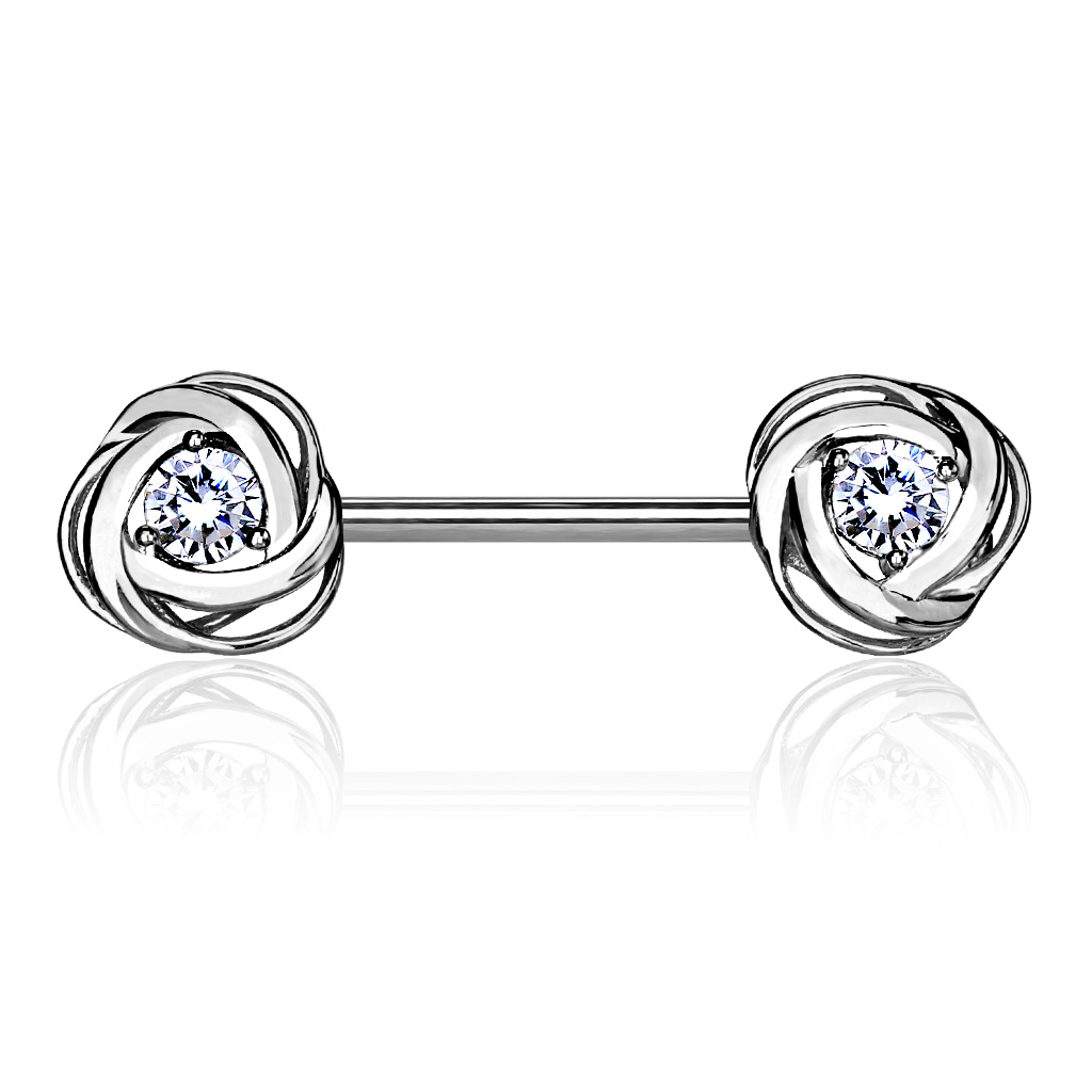 Je kijkt hier naar een mooie en speelse tepelpiercing, gemaakt van chirurgisch staal. Het sieraad heeft een roosje aan ieder uiteinde van de staaf. De roosjes zijn gemaakt van messing en hebben een vastgemonteerd steentje in het midden. Aansluitend zijn de roosjes bedekt met een glanzend laagje voor een glanzend oppervlak - de blank glanzende varianten hebben een blank laagje gekregen, terwijl de gouden variant een deklaagje van 14 karaats goud heeft.