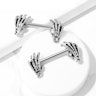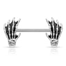 Als je deze piercing in je tepel draagt, heb je een skeletachtige hand die aan weerszijden van je tepel kruipt. De handen zijn namelijk verbonden via een 1.6 mm dikke chirurgisch stalen staaf. De afstand tussen de handen is ong. 12 mm. Natuurlijk kan een hand worden losgeschroefd, want anders is het bijna onmogelijk om het sieraad in te doen. Beide handen zijn gemaakt van messing dat vervolgens gerhodineerd is om hetzelfde uiterlijk te krijgen als de staaf. Tussen de botten van de handen zit een zwarte kleur, waardoor het sieraad er geoxideerd en een beetje antiek uitziet. Tegelijkertijd geeft het een goed spel aan de algehele uitdrukking. De handen meten ongeveer 12x7 mm.