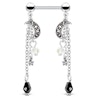 Deze tepelpiercing heeft wat weg van een melkwegstelsel. Je vindt er zowel manen als sterren en kleine 'meteorieten' in de vorm van facetgeslepen steentjes. Alle onderdelen van de hangers hangen vrij langs elke zijkant. Het staafje uit chirurgisch staal meet 14 mm in de lengte. Het maatje dat zich bovenaan de hanger bevindt, werd met drie kleine steentjes voorzien. Naargelang de lichtinval fonkelen deze steentjes in een robijnrode/paarse kleur. Rond de steentjes bevinden zich gaatjes, waardoor je door het maantje heen kunt kijken. Onder de maan hangt een transparant steentje en daaronder een ster, die in het midden ook een transparant steentje bevat. Als afsluiter is er een grotere zwarte steen onderaan de hanger. Dit juweel is voor speciale gelegenheden ontworpen waarin ze zich vrij kunnen bewegen, en niet onder kledij worden verborgen.