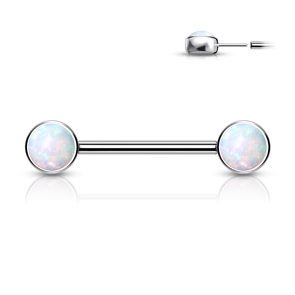 Het hele sieraad is gemaakt van titanium. De staaf heeft een lengte van 14 mm waardoor het in de meeste tepels past. De opaalstenen zijn 6 mm groot en hebben een vlakke achterkant. De opalen zijn niet echt maar imitatiestenen. Ze zijn niet vastgelijmd aan het metaal maar zitten vastgeklemd. Je kunt uit verschillende kleuren kiezen.