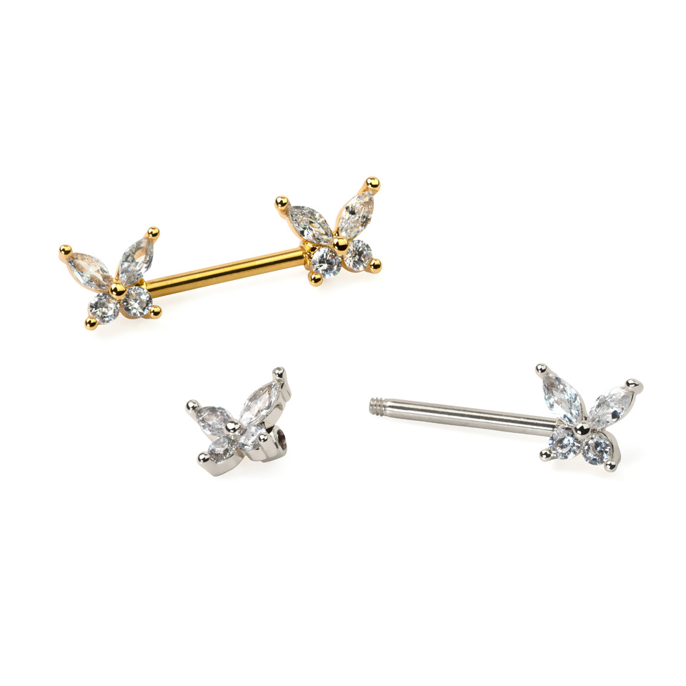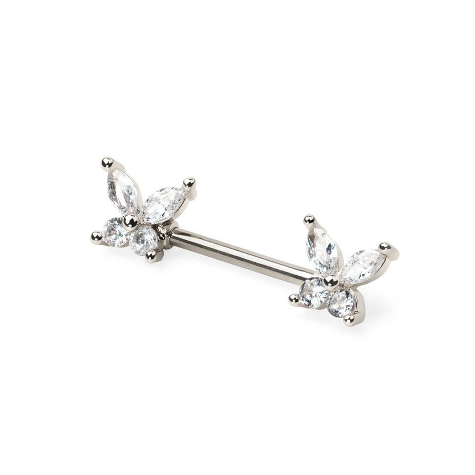 Dit statement sieraad toont klasse en stijl, en is een must-have voor je collectie. De vleugels van de vlinders dragen zirkonia steentjes, die verfijning aanbrengen aan een zeer schattige tepelpiercing.