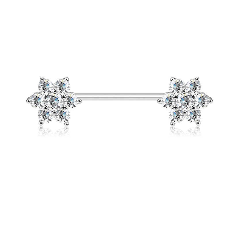 Super fijne en elegante tepelpiercing met prachtig glimmende bloemen aan beide kanten van het staafje.