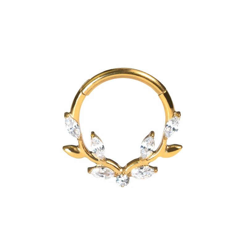 Deze premium vooruitgerichte clicker ring met een prachtig blaadjesontwerp zal er prachtig uitzien in piercings zoals een daith en septum. Doordat het gemaakt is van titanium is het sterk en hypoallergeen. Een geweldige toevoeging aan je collectie.