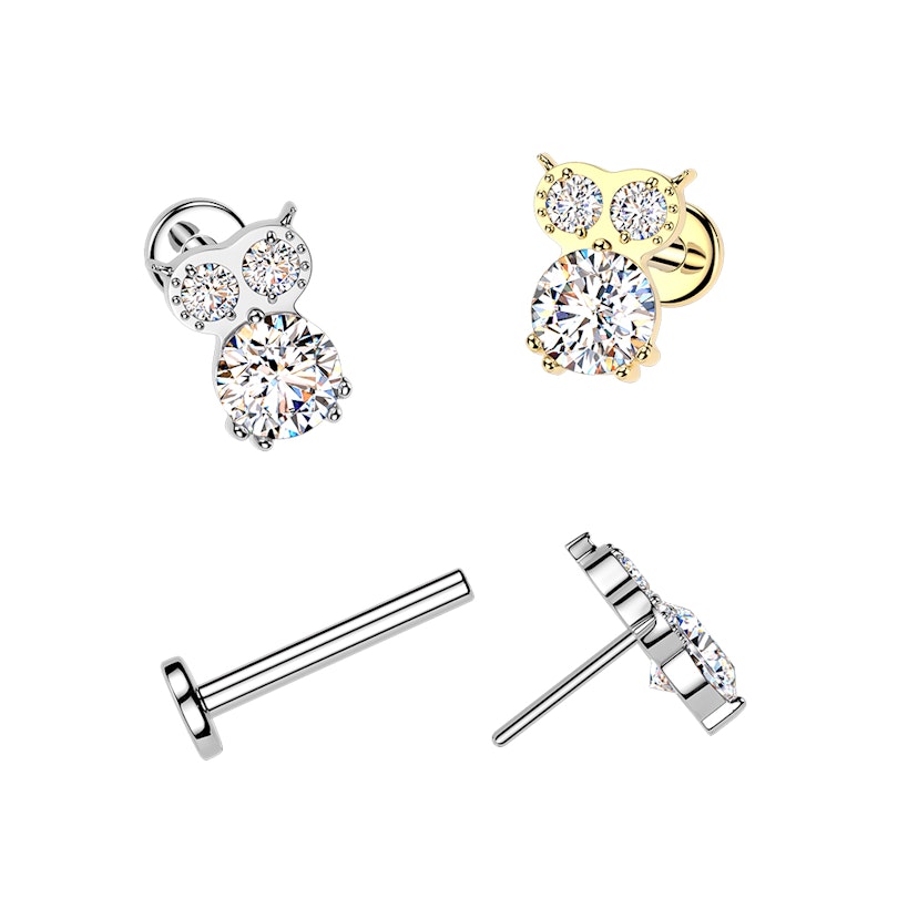De titanium labret in uilvorm met steentjes geeft je ear stack net wat karakter. Het uiltje is gedetailleerd met meerdere steentjes die netjes in een tandzetting zijn gezet, waardoor het ontwerp meer textuur heeft zonder dat het druk oogt. Verkrijgbaar in gouden en zilveren afwerkingen, ideaal als je iets met vorm en karakter wil in plaats van een minimalistische look.