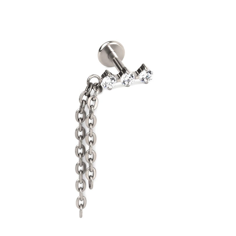 Naam: Titanium labret met trio van steentjes en dubbel kettinkje
