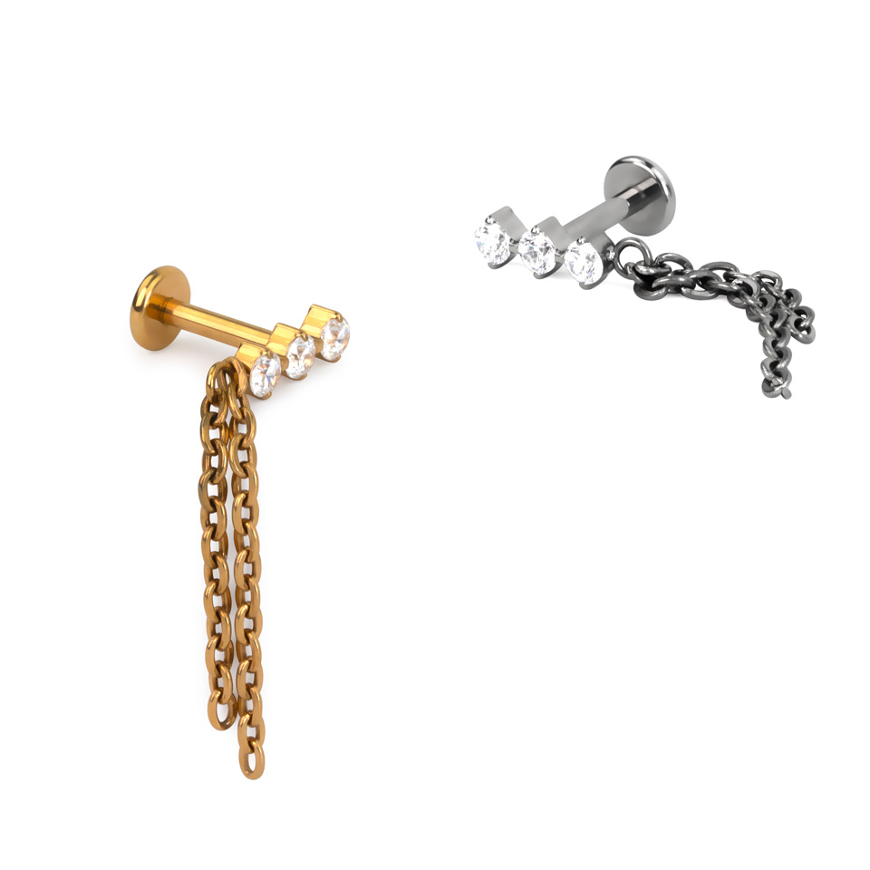 Titanium labret met trio van steentjes en dubbel kettinkje