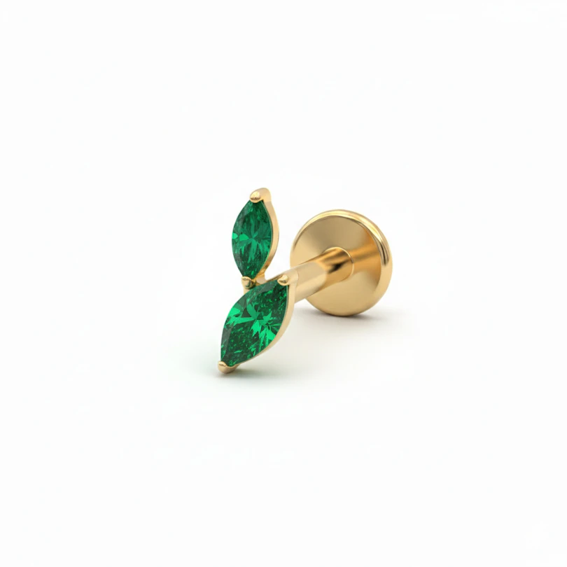 Deze titanium labret met twee marquise snit stenen is bewijs dat minder meer is. De twee stenen zijn geplaatst als blaadjes of vleugels, waardoor je oor een perfecte lift krijgt zonder volledig de aandacht op te eisen.