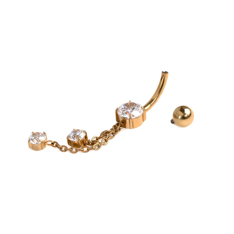 Niet alle navel piercing sieraden zijn gemaakt om mee te pronken, maar deze titanium navel ring met kettinkjes en steentjes weet wel hoe het moet. Een gladde titanium barbell met een glimmende steen, afgemaakt met twee elegante kettinkjes die naar beneden vallen en in het licht glinsteren met elke beweging. Moeiteloos mooi, want waarom niet!