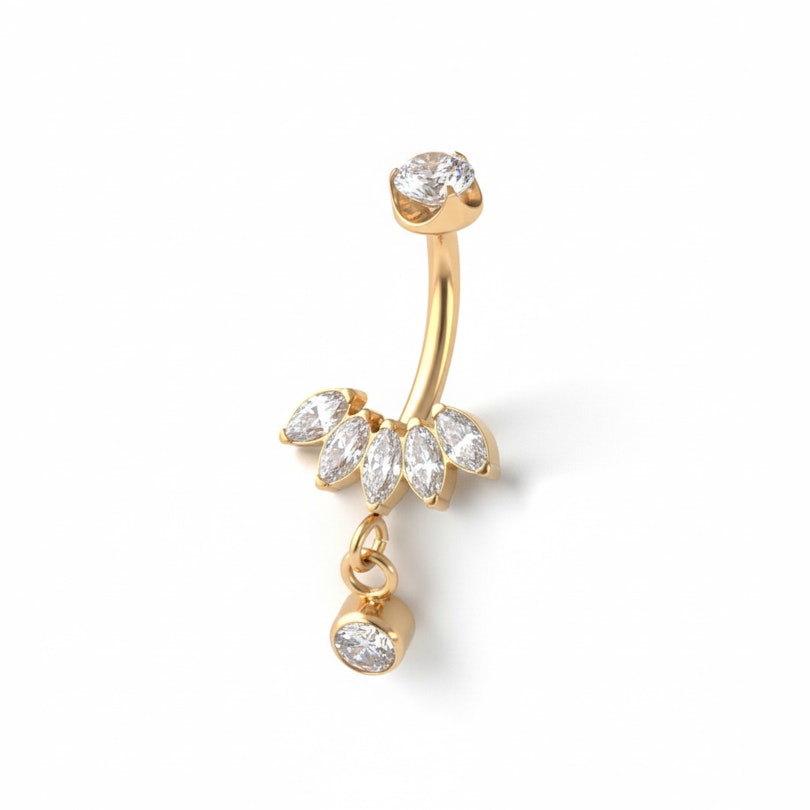 Het ontwerp? Een cluster glinsterende marquise-snit stenen die bij je navel hangen, afgemaakt met een elegante hangende bedel die in het licht glinstert elke keer dat je beweegt. Dit sieraad komt in het zilver en goud zodat je de kleur kan kiezen die bij je past. Het interne schroefdraad maakt met makkelijk om te dragen zonder gedoe, en we adviseren gematigd gebruik vanwege het ontwerp.