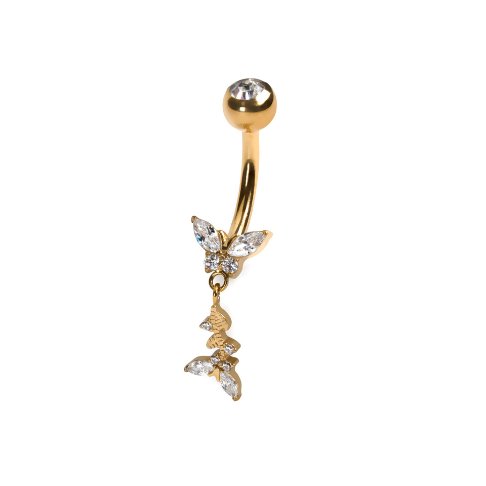 Deze prachtige titanium navelring met vlinders heeft een centrale vlinder met een hangertje met steentjes om een effect van vallende blaadjes te maken. Doordat het gemaakt is van titanium is het waterproof, en geschikt voor de gevoelige huid.