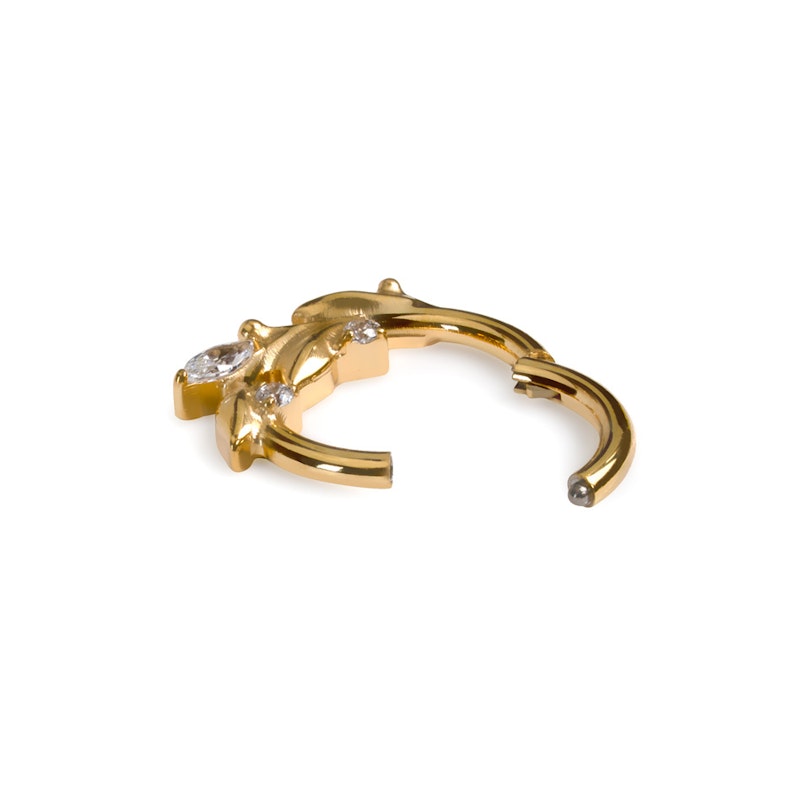 Deze prachtige titanium ring met elegante blaadjes is gemaakt van titanium, waardoor het geschikt is voor gevoelige huid. Het scharniermechanisme betekent dat het makkelijk vast te maken is in je piercing.