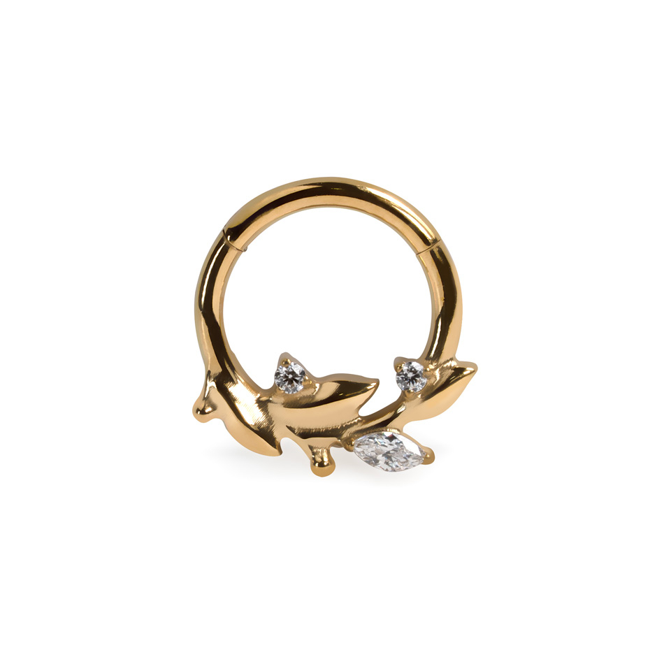 Deze prachtige titanium ring met elegante blaadjes is gemaakt van titanium, waardoor het geschikt is voor gevoelige huid. Het scharniermechanisme betekent dat het makkelijk vast te maken is in je piercing.