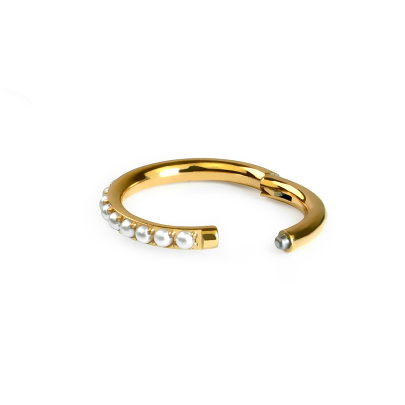 Voeg een vleugje elegantie toe aan je piercings met deze prachtige ring, gezet met synthetische parels voor een look die chic en tijdloos is.