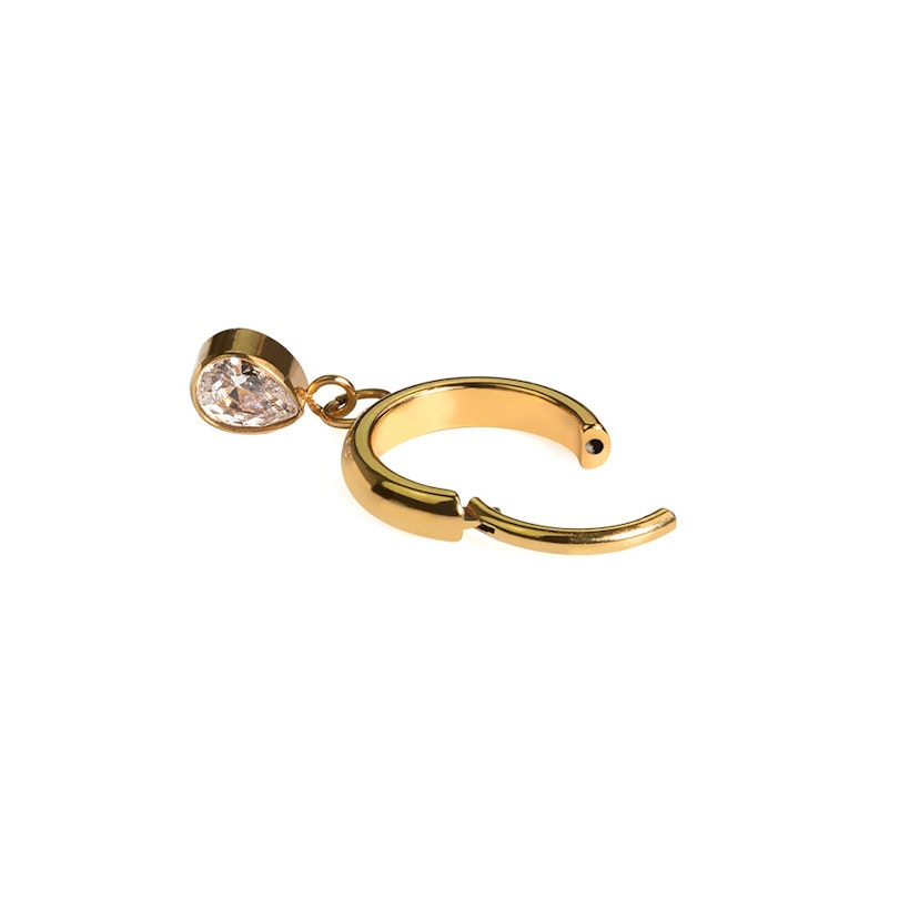 Het heeft een traanvormige CZ steen gezet met een bezel, die vastzit aan de ring met twee kleine ringetjes. De traan zelf is 4,5 mm.
