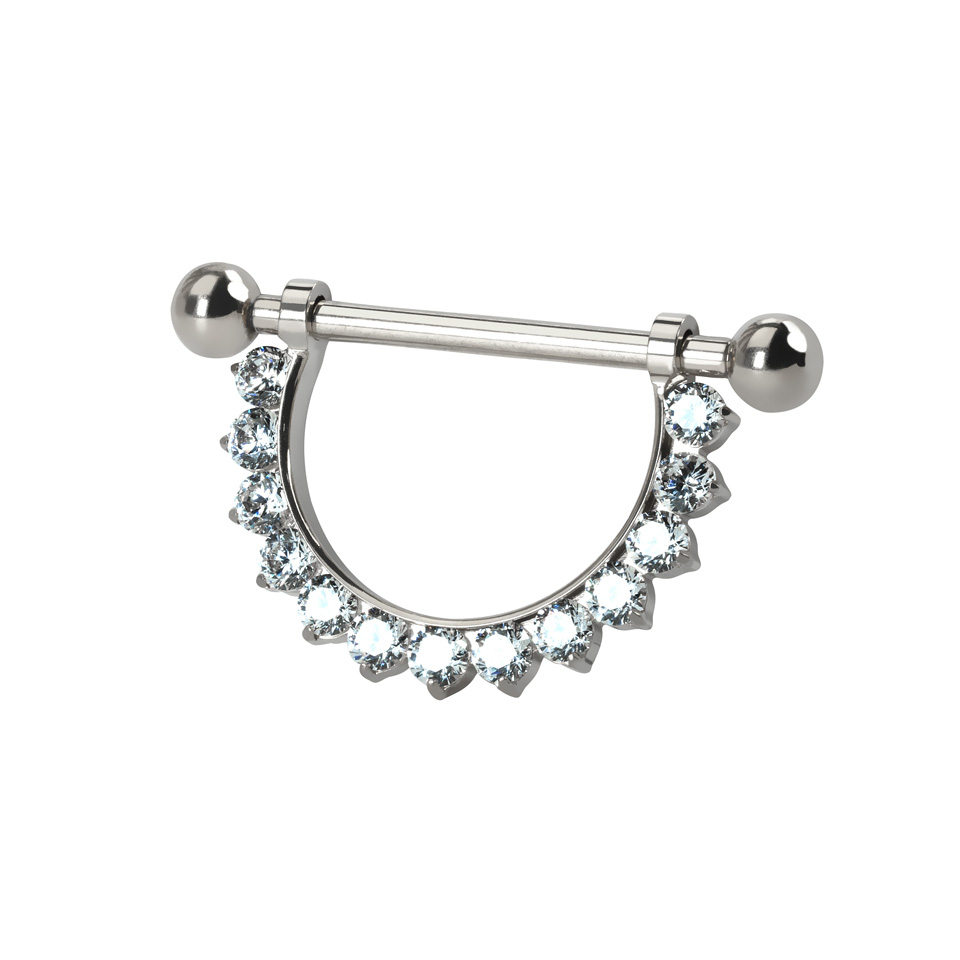 Deze prachtige tepel ring is gemaakt van implantaatgraad titanium. Het bestaat uit een simpel staafje met een intern schroefdraad die door de piercing heen gaat. Aan het staafje zit een glinsterende halve cirkel met pave gezette CZ stenen die je tepel prachtig zal omlijsten.