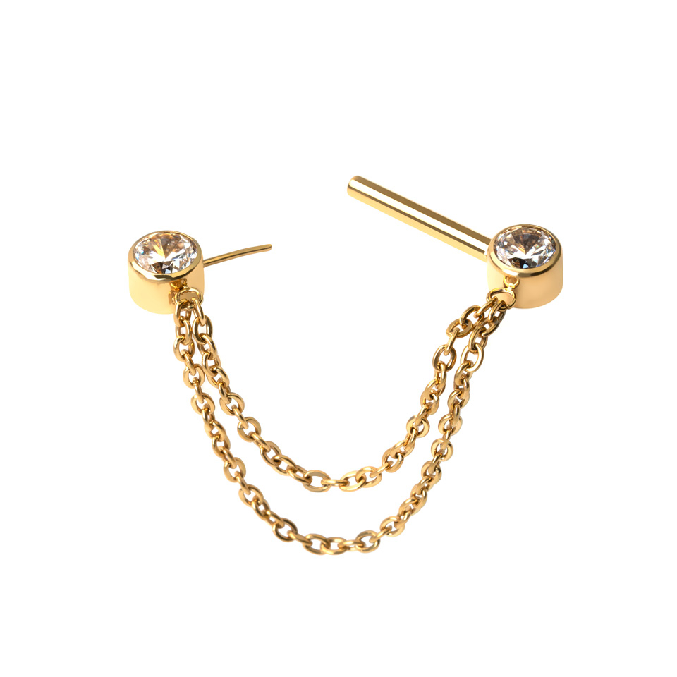 Deze tepel barbell is gemaakt van implantaatgraad titanium en heeft CZ steentjes in de balletjes. Dit unieke sieraad heeft ook 2 titanium kettingen die hangen onder de tepel. Ze zijn vastgemaakt aan de balletjes met een klein ringetje.