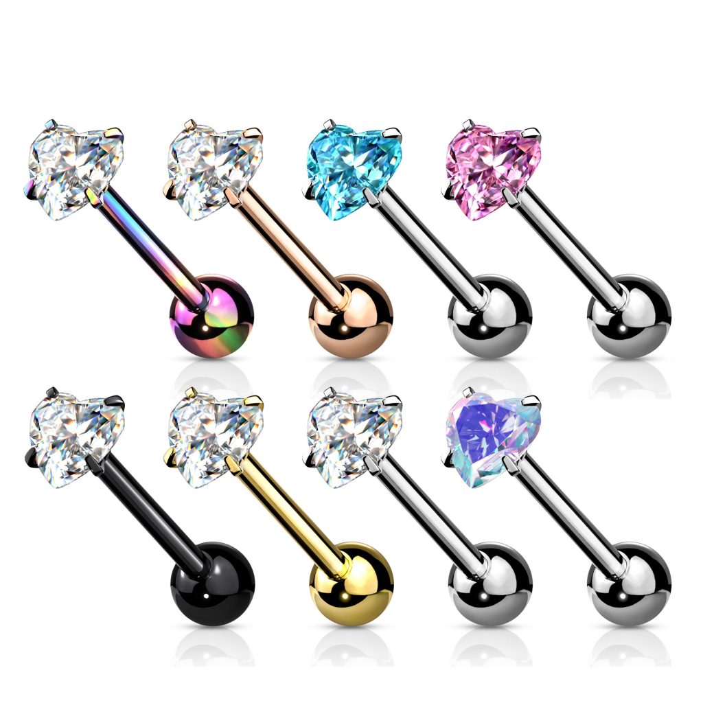 De tongpiercing die je hier ziet, heeft een plat stenen hart bovenaan de staaf. Aan het andere uiteinde van het 16 mm lange staafje zit een vergrendelingsbal. Het hartje zit vast en kan niet worden losgeschroefd. Het vergrendelingsballetje kan natuurlijk wel worden losgeschroefd. De bal en het staafje hebben dezelfde kleur. Kies uit de kleuren die je in de productafbeelding ziet. Alleen de zilveren variant is beschikbaar met verschillende kleuren steen. Het hart van dit sieraad zit vast met vier kleine armpjes. Er is geen lijm gebruikt om de steen te bevestigen dan na verloop van tijd kan oplossen door verschillende vloeitstoffen in de mond. De armpjes zijn niet scherp, maar ze kunnen wel het gehemelte irriteren als je de piercing heen en weer in je mond laat bewegen.