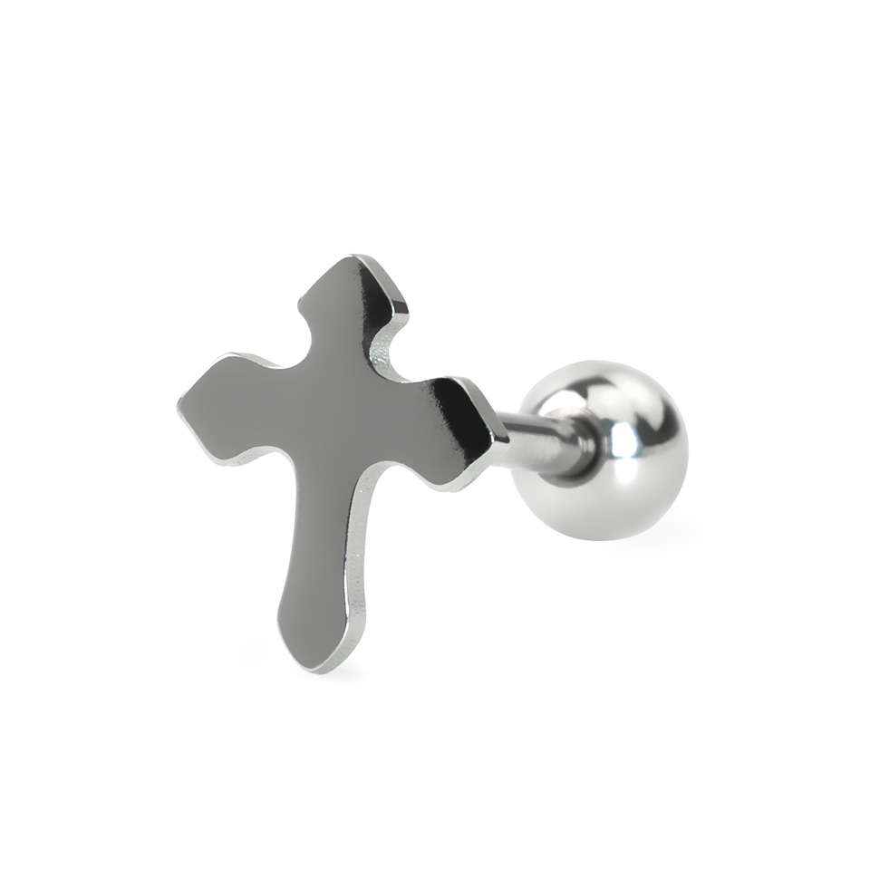 Dit sieraad is van het veilige chirurgische staal gemaakt en dus ook zeer massief. Chirurgisch staal verliest zijn kleur niet, en het materiaal wordt ook niet aangetast door verwering. Wij raden echter altijd aan om chirurgisch staal alleen te dragen in piercings die volledig geheeld zijn. De topbal heeft de vorm van een kruis, en kan niet van het sieraad afgeschroefd worden. De maten van het kruis zijn 2,5 mm in de hoogte, 10 mm in de breedte en 12 mm in de lengte wanneer het in de tong zit.