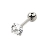 Hier zie je een tongpiercing met een platte bal. Het beslaat minder dan een gewone bal en is tegelijkertijd volledig van steen gemaakt. Dus als je je mond open doet, zal de grote sprankelende steen er snel uitspringen in tegenstelling tot gewone metalen ballen met een kleine steen erin.