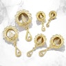 De tunnel die je hierboven ziet, is beschikbaar in twee edities. Een glanzend zilver en goudkleurig model. Ze zijn 100% identiek, behalve de kleur. Beide modellen zijn verkrijgbaar in zes maten, variƫrend van 6 - 16 mm. De druppel en het hele model veranderen evenredig met de grootte die je kiest voor het sieraad. Er zitten eigenlijk twee druppels op dit sieraad - een die vrij onder de tunnel hangt en een in de ring die vastzit in de tunnel, die ook een parelmoeren inleg heeft. Rond de tunnel zit een krans met eigenzinnige armen, die samen een filigraanpatroon vormen.