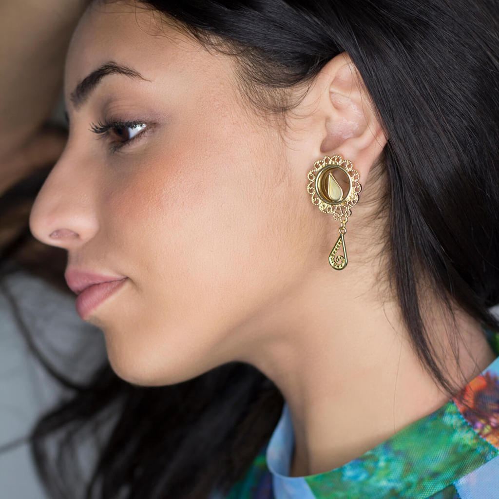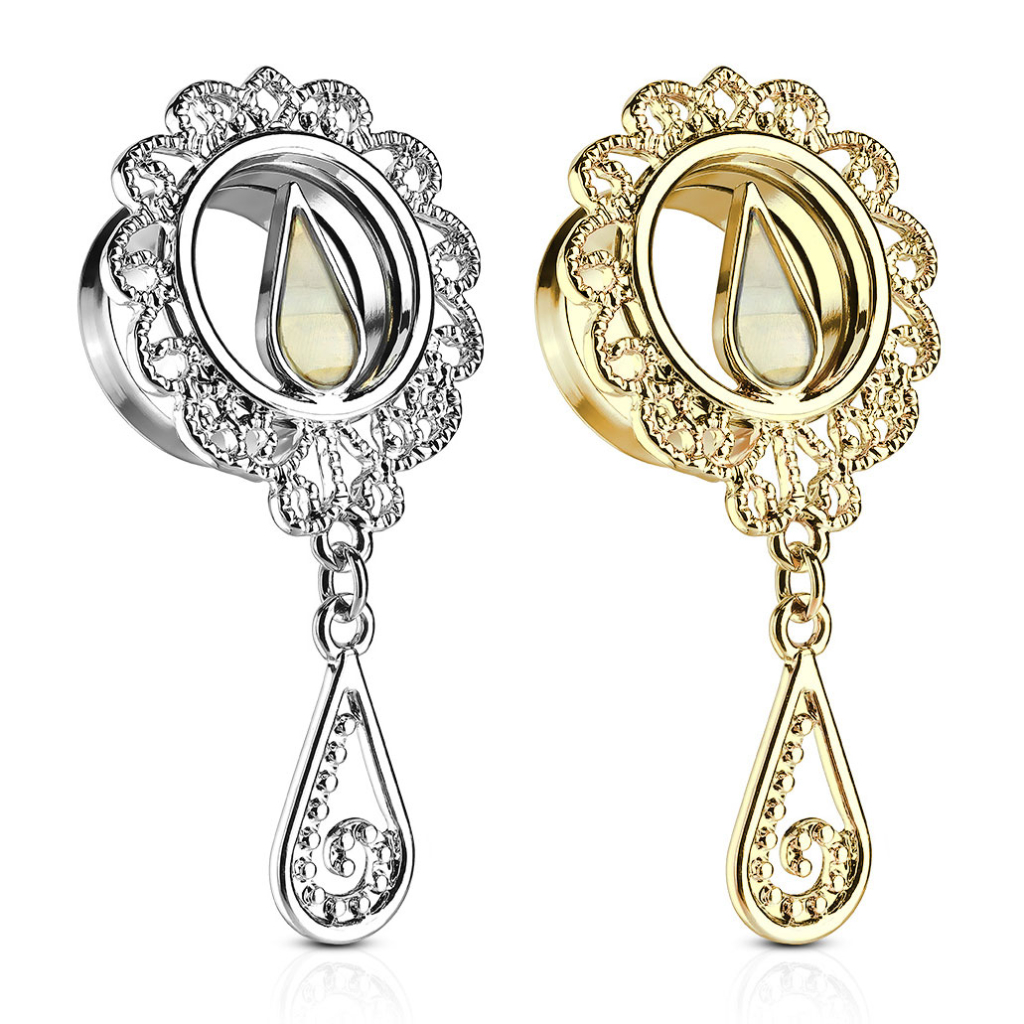 De tunnel die je hierboven ziet, is beschikbaar in twee edities. Een glanzend zilver en goudkleurig model. Ze zijn 100% identiek, behalve de kleur. Beide modellen zijn verkrijgbaar in zes maten, variƫrend van 6 - 16 mm. De druppel en het hele model veranderen evenredig met de grootte die je kiest voor het sieraad. Er zitten eigenlijk twee druppels op dit sieraad - een die vrij onder de tunnel hangt en een in de ring die vastzit in de tunnel, die ook een parelmoeren inleg heeft. Rond de tunnel zit een krans met eigenzinnige armen, die samen een filigraanpatroon vormen.
