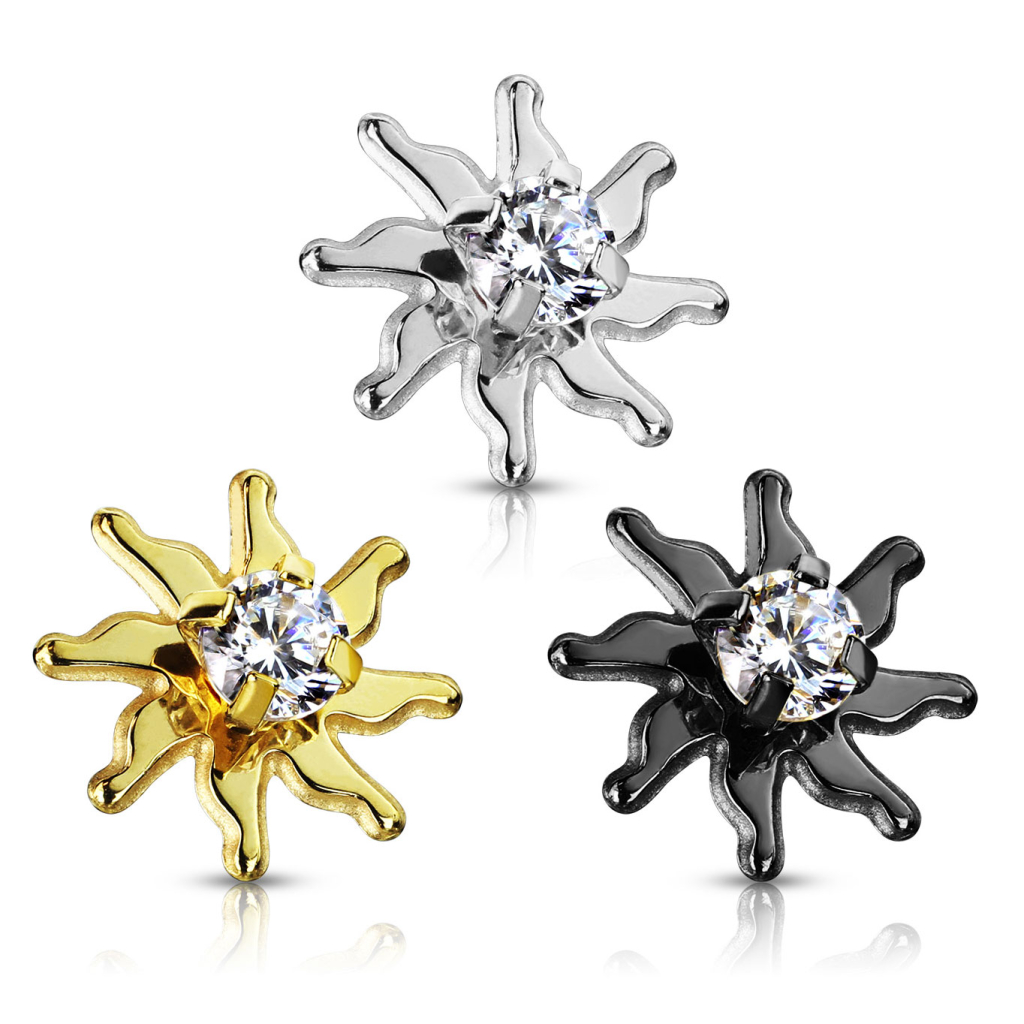 Deze top kun je gebruiken als je een dermal anchor onder je huid hebt. De top schroef je gemakkelijk op je al bestaande base, waarna je een prachtig zonnetje op je huid hebt schitteren. De 8 zonnestralen zijn gebogen, en ze wekken daardoor dan ook een beetje de indruk dat de zon in beweging is, aangezien de stralen dezelfde richting uit wijzen.