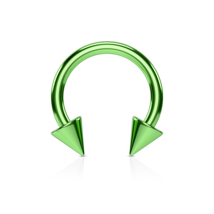 Een hoefijzer met spikes geeft elke piercing een totaal andere look - ietwat opvallender en ruwer dan pakweg gewone piercingsieraden. Zo een hoefijzer verleent niet alleen een andere look aan je piercing, ook optisch lijkt het groter. Alle modellen zijn bij ons in veel mooie kleuren te verkrijgen.