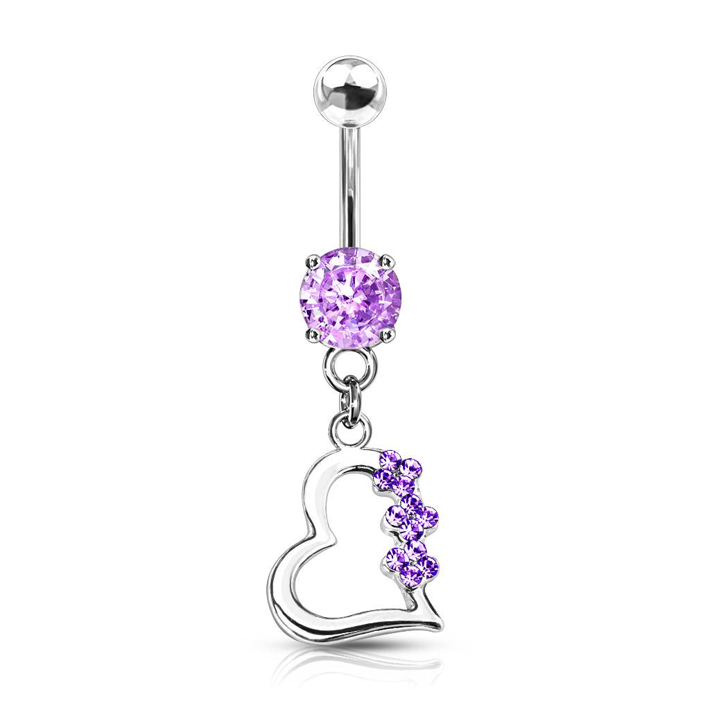 Prachtig bewerkte navelpiercing met een indrukwekkend ontwerp van een grote, fonkelende steen met kleinere steentjes in de hartvormige hanger. Het sieraad is in drie verschillende kleuren verkrijgbaar en het enige wat je dan nog hoeft te doen is je favoriete kleur uit te kiezen.