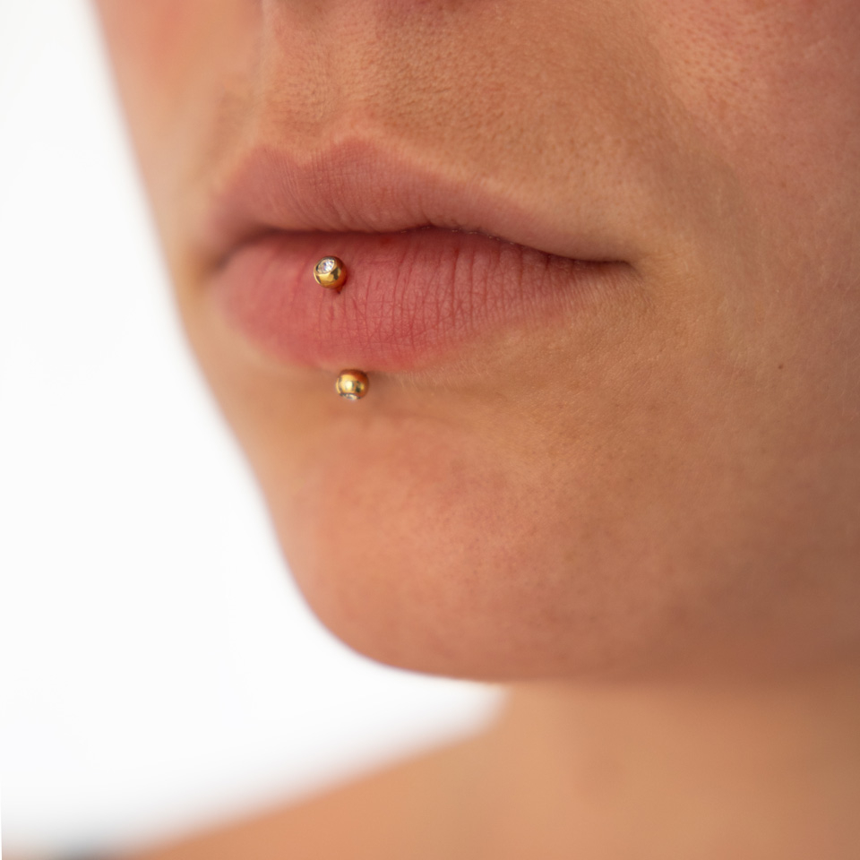 Dit sieraad is gemaakt van chirurgisch staal en in de laatste fase van het productieproces met een laagje goud bedekt. In de beide balletjes is een klein steentje verwerkt. Dit sieraad is in eerste instantie bedacht voor wenkbrauwpiercings, maar kan natuurlijk ook voor tepel- en intiempiercings gebruikt worden.