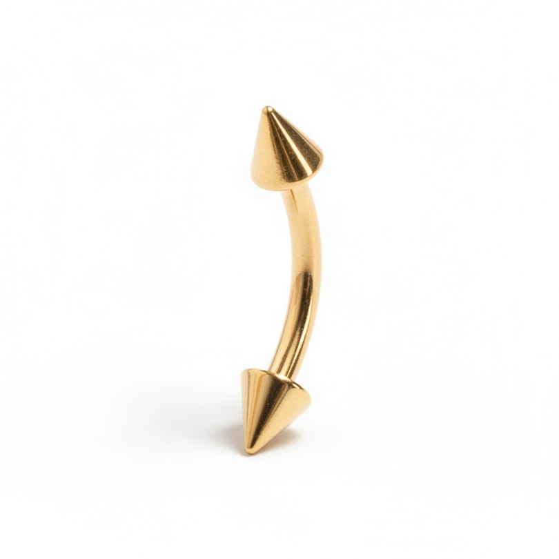 Wil je een nieuwe look hebben voor je tepelpiercing of je wenkbrauwpiercing? Bekijk dan eens deze mooie gebogen staaf met een mooie gouden coating en twee uitdagende spikes aan de uiteinden. Het sieraad is verkrijgbaar in twee verschillende draaddiktes en twee verschillende lengtes voor elke draaddikte, en het hangt allemaal af van de plek waar je het wilt gaan gebruiken. De gebogen staaf is ook heel prima te gebruiken in intiempiercings voor vrouwen, dus ook hier voor heb je nu de mogelijkheid om je look een beetje op te frissen met iets nieuws en uitdagends.
