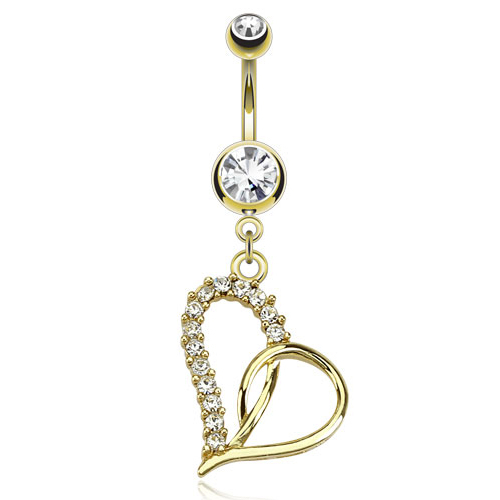 Hier hebben wij een werkelijk mooi en elegant hartje in een uniek design, wat van iedere navelpiercing een eyecatcher maakt. Het sieraad is met een dunne coating bladgoud bedekt en heeft een staaflengte van 10 mm, wat de standaardlengte is. De beide sluitballetjes zijn van een transparante steen voorzien, net zoals het hangertje.