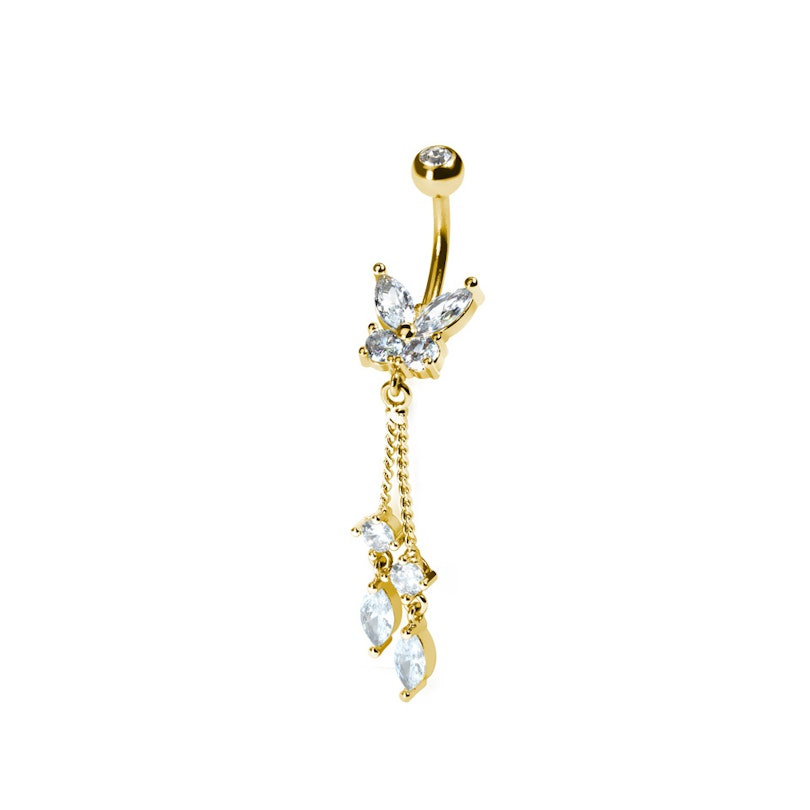Deze glinsterende navel ring heeft een prachtige vlinder op de onderste bal, met meer glinsterende steentjes in het hangertje wat onderaan de vlinder hangt, vastgemaakt met elegante kettinkjes.
