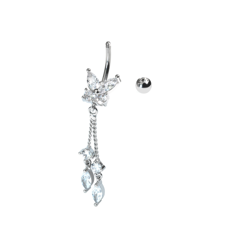 Deze glinsterende navel ring heeft een prachtige vlinder op de onderste bal, met meer glinsterende steentjes in het hangertje wat onderaan de vlinder hangt, vastgemaakt met elegante kettinkjes.