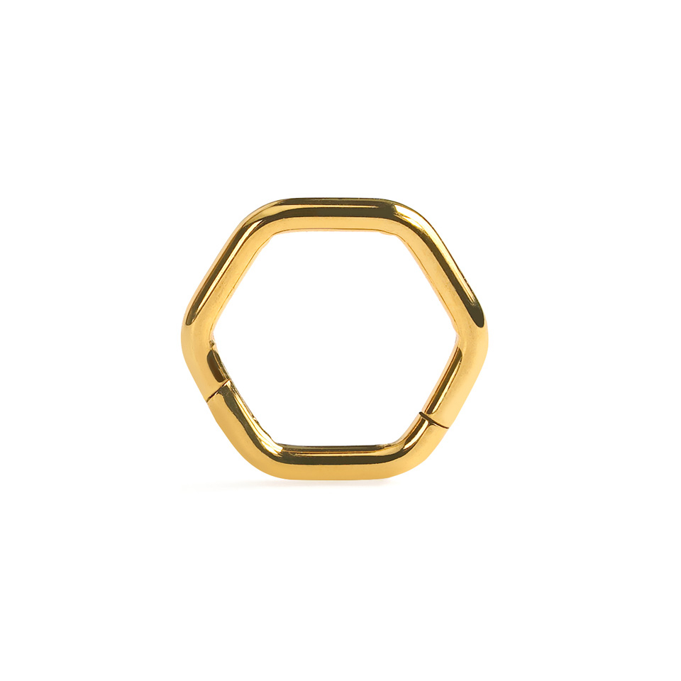 Deze zeshoekige titanium scharnierring is het ultieme veelzijdige sieraad. Je kan het dragen in verschillende oor piercings, waaronder helix, oorlel en daith. Het ziet er ook goed uit als neusvleugelring. Doordat het gemaakt is van titanium is het hypoallergeen en waterproof, en het simpele ontwerp is comfortabel genoeg om te blijven dragen.