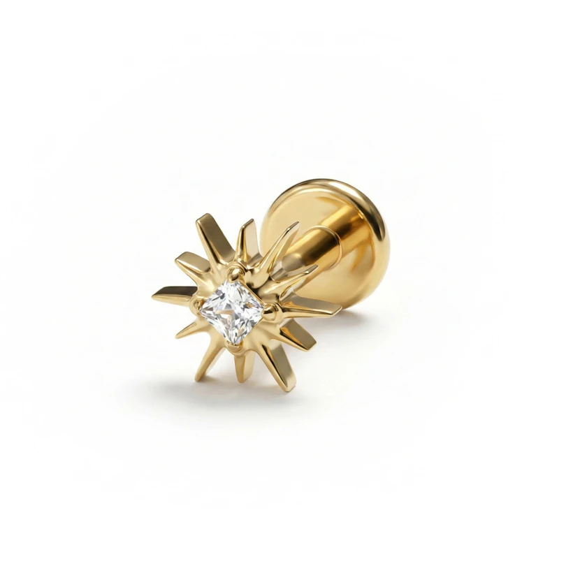 Geef je stack wat extra uitstraling met deze zonnestraal-labret van titanium. Het bloemachtige, licht vangende design geeft subtiele diepte, terwijl je styling strak blijft en elke dag draagbaar is.